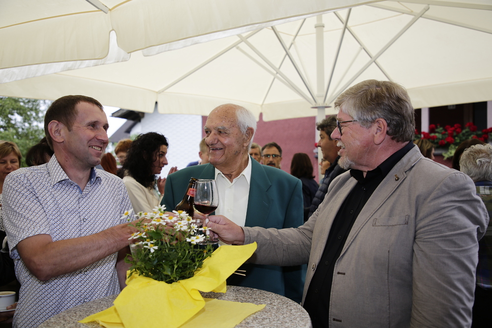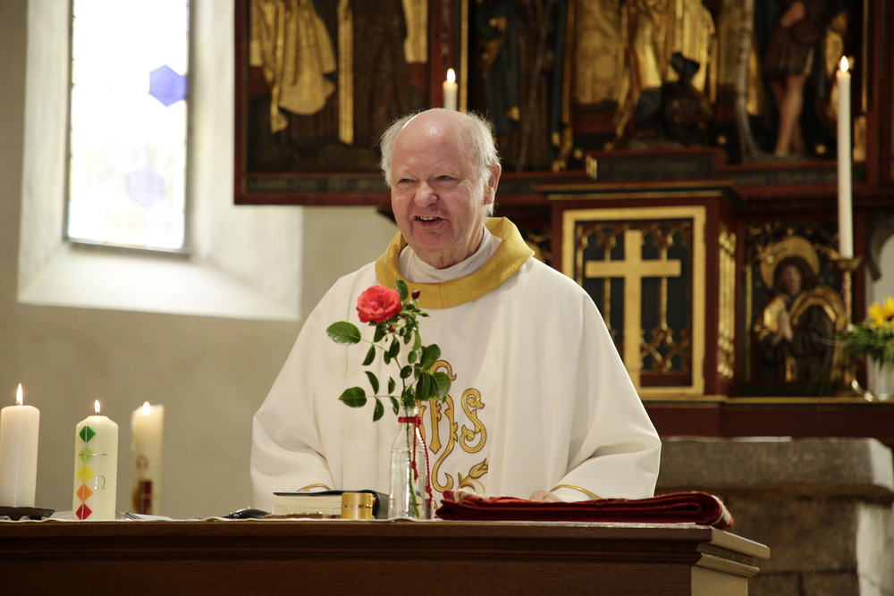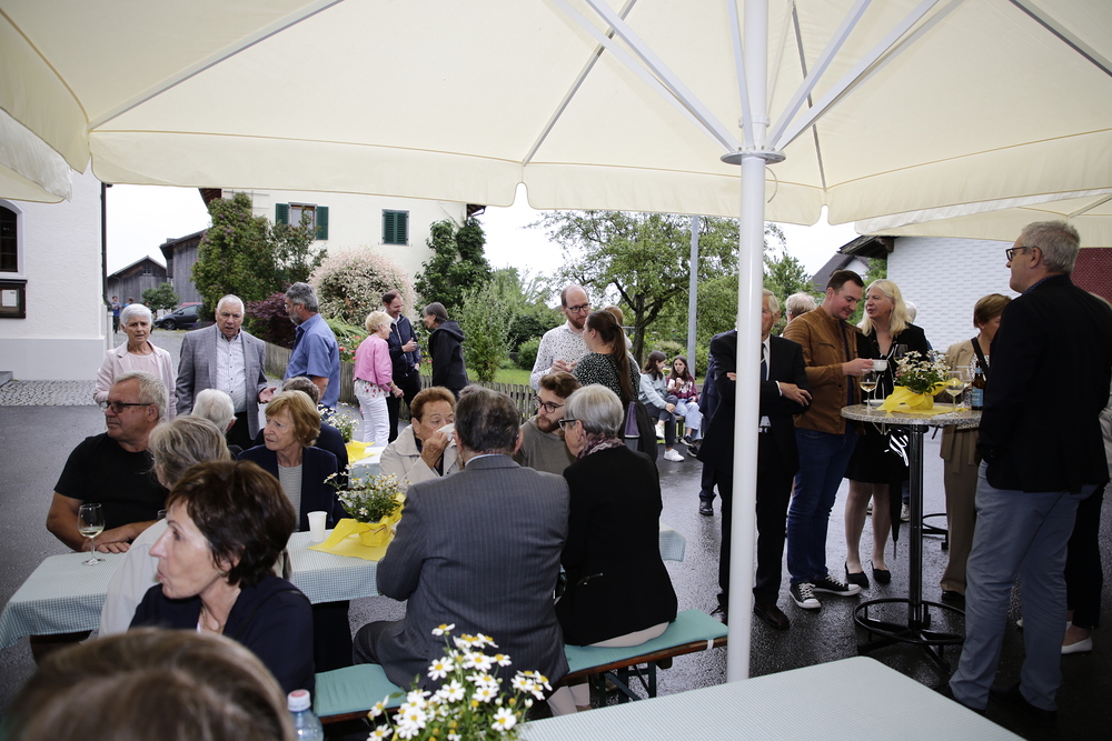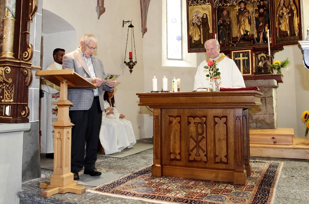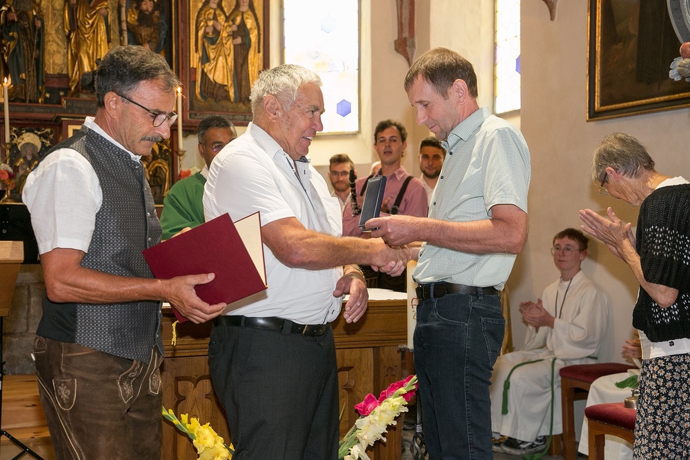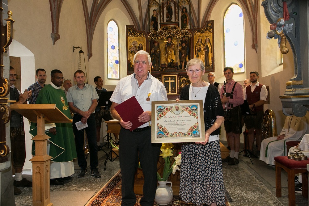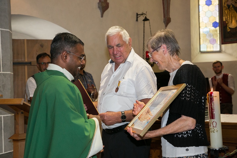 Pfarrer Lojin sprach Reinold großen Dank aus und überreichte ihm und Christl eine Urkunde mit päpstlichem Segen. Die Kirchenräte Wolfgang und Michael überreichten Reinold das Dekret von Bischof Benno und die Verdienstmedaille der Diözese Feldkirch.